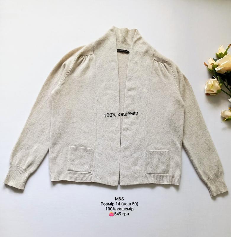Кардиган кашемир от M&S. Размер 14 (наш 50). Состав: 100% кашемир. Замеры: длина по спинке 55 см, ПОГ 54 см, ПОТ 53 см, ПОБ 50 см резинка, плечо 10 см, длина рукава 61 см, высота ворота 10 см. Состояние новое.