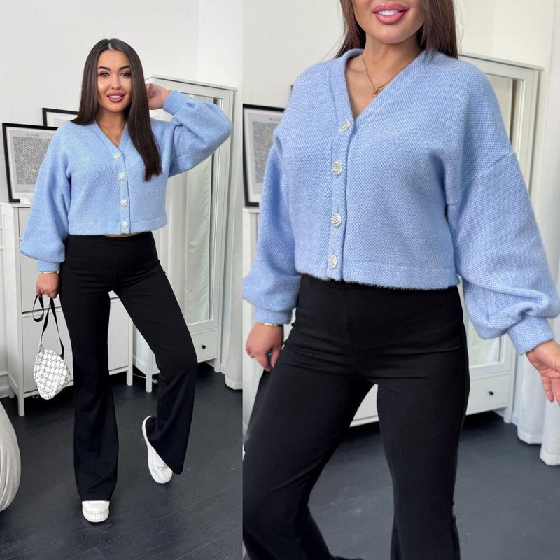 Кардиган арт. pani. 692 Цвет: желтый, розовый, голубой Размеры: S, М, L Тканина: трикотаж «альпака» Стильный и нарядный кардиган на пуговицах со стразами. Модель укороченого кроя с V-образной горловиной и длинными объемными рукавами. Замеры указаны на параметры. Цена 1000 грн