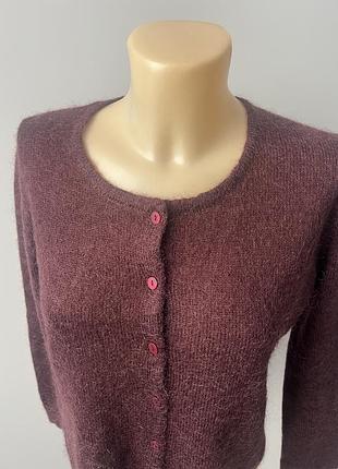 Тепленький та мʼякий кардиган з 38% мохеру. Заміри: ширина в грудях 46 см ширина в талії 43 см ширина плечей 38 см довжина рукава від горловини 62 см довжина рукава по внутрішньому шву 36 см довжина виробу по спинці 51 см