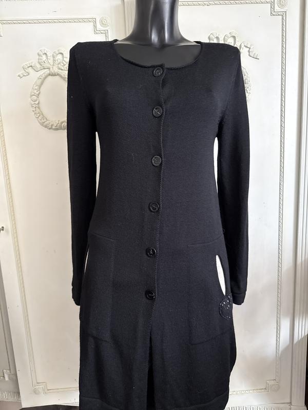 Країна походження-Італія. Колір чорний. Склад:вовна-100/. Застібка-гудзики, два кармани(кармани всередині білого кольору. Розмір по біпці-М. Заміри: довжина-89 см, ПОГ-41 см, ПОБ-44 см, рукав-62 см. Стан ідеальний. Це та сама вовна, що не створює катишки.
