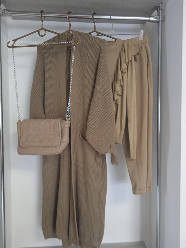 Стильный однотонный кардиган с длинным рукавом приятного цвета кофе с молоком. Теплый и комфортный. Приятный на ощупь. Фактурная машинная вязка. Объемная нить. Тянется с легкостью. Ложится свободно -оверсайз. Плечи спущены. Без застежки. Широкий рукав-фонарик. Есть карманы. Есть размеры. 52р на пог-56-58 50р на пог-54-56 Длина-110см.