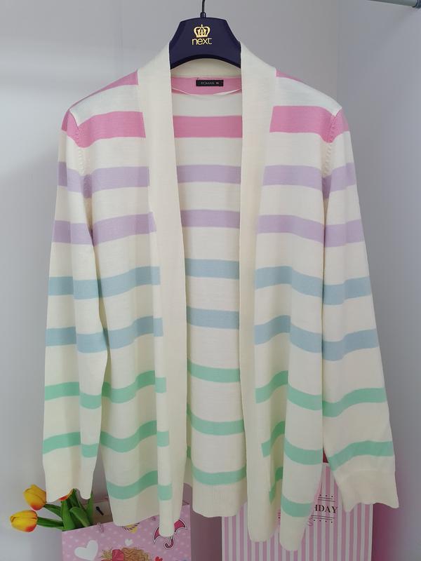 Очень красивый весенне летний кардиган Невероятно красивое сочетание нежных цветов розового-фиолетового-голубого-бирюзового и молочного 👌 Размер 16, также рекомендую и на размер 14 Длина рукава от плеча 64 см Длина по спине 72 см (Длина без стойки, от шва на шее и вниз) Состояние отлично Цена 220 грн🏷