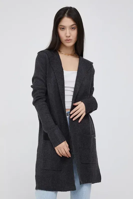 Кардиган распашной.. Меланжевая пряжа. Кардиган с карманвми и капюшоном
