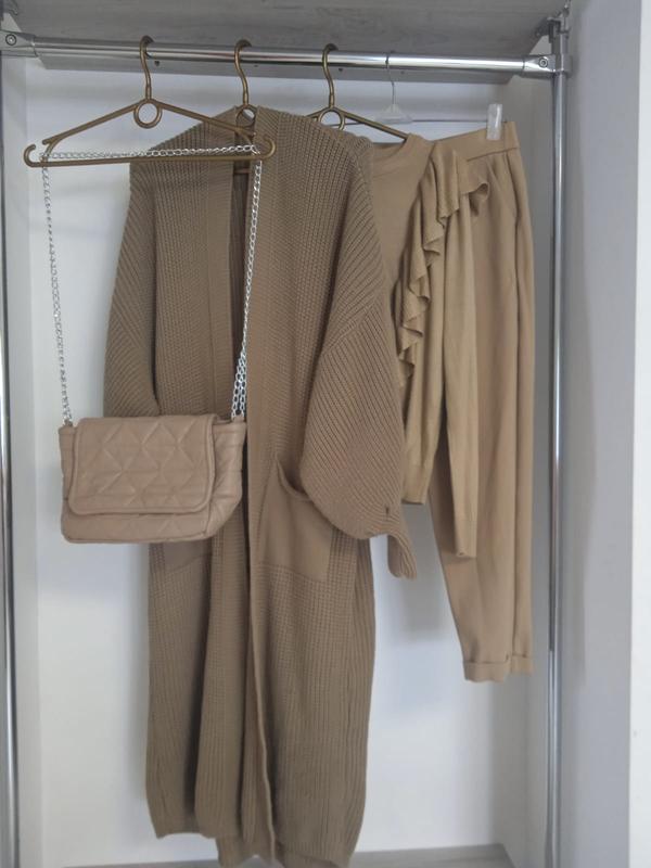 Стильный однотонный кардиган с длинным рукавом светло коричневого цвета Теплый и комфортный. Приятный на ощупь. Фактурная машинная вязка. Толстовка нить. Тянется с легкостью. Фасон прямой. Ложится свободно -оверсайз. Без застежки. Есть карманы. Плечи спущены. Интересные перчатки -фонариком. Есть размеры.