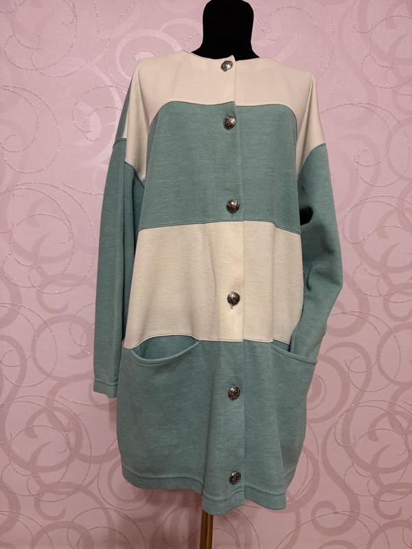 Ніжно бірюзовий з білими полосами є глибокі кишені , прямий уздовжений .плечі приспущені 62; рукав 48; довжина 78.
