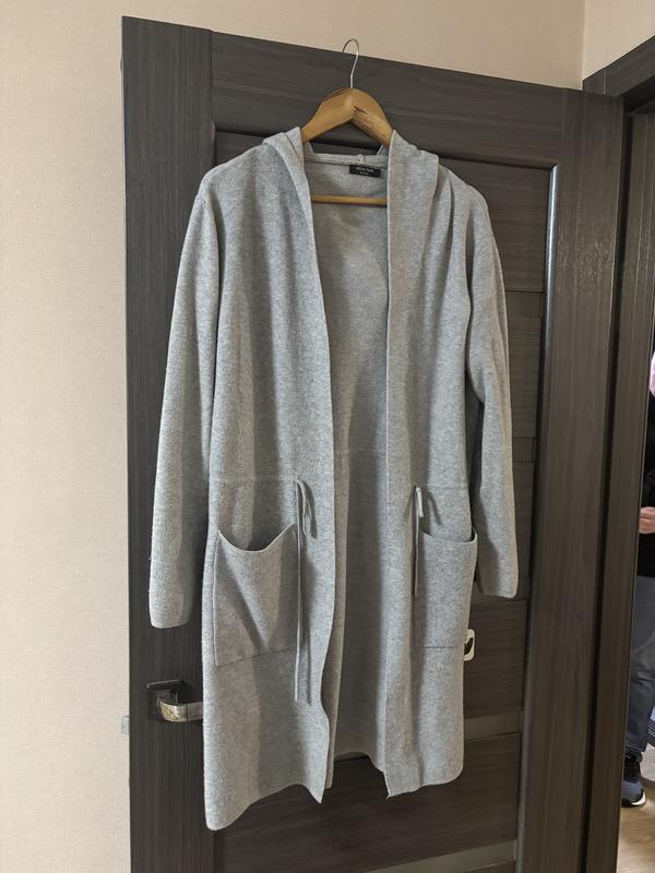 Кардиган довгий сірого кольору. Є капюшон, кармани та куліска на талії, теплий. Довжина кардигану 100 см, довжина рукава 60 см. Стан хороший.