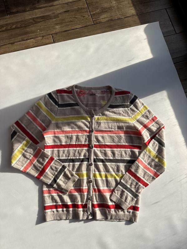 Тонкий кардиган сеточкой на пуговицах, в полоску. Пуговицы брендированные Состояние идеальное Размер S Плечи 35 Рукав 62 Грудь 45 Ширина низ 38 Длина 58