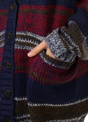 Кардиган выполнен из пушистого трикотажа в полоску. Модель свободного силуэта. Детали: застежка на пуговицы, край в рубчик, два боковых кармана, заниженная линия плечей. Размер XS, но этот кардиган сделан в стиле оверсайз, поэтому сильно большемерит. Мерки: ширина - 58 см, длина рукава - около 60 см, длина - 70 см.