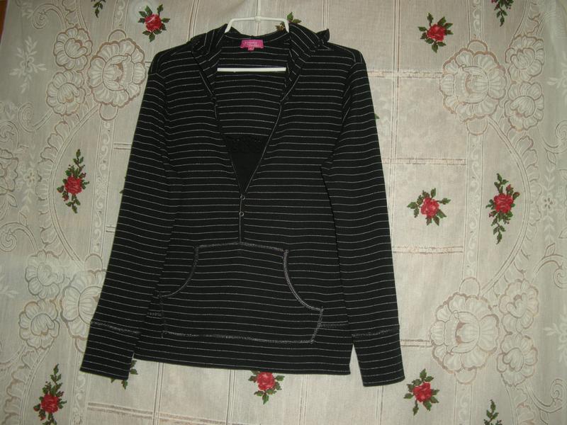 Шикарная стильная кофточка черного цвета в серебристую полоску,фирменная-pineapple",с капюшоном,натуральная-100%коттон,красивый фигурный вырез,под вырезом вставка из черного кружева,на животе общий карман,низ-широкий 10см. манжет,низ рукавов тоже манжет,все это прошито серебряными нитями,объем груди-106см.,рукав-60см.,длина -60см.