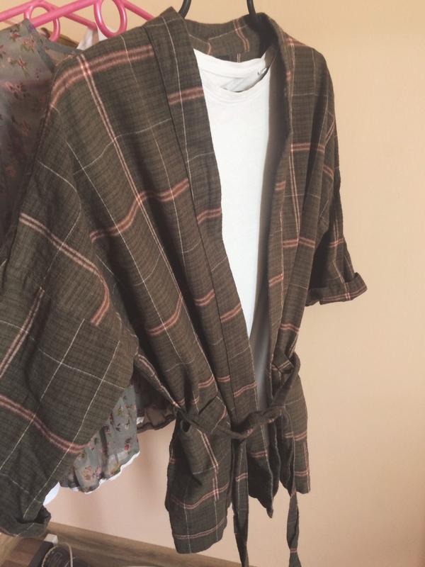 Кардиган темно-зеленого кольору/колір хакі в клітинку. Розмір XS-S. За потреби можу надіслати додаткові фото.