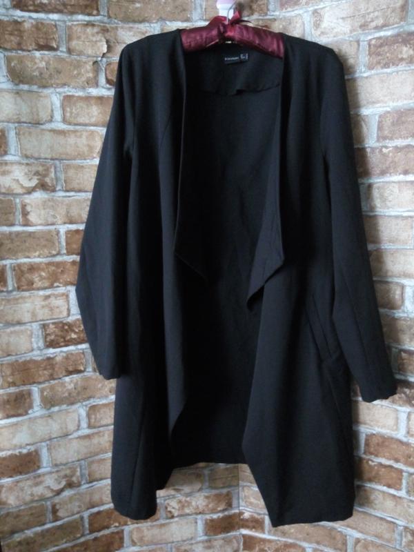 Стильный френч кардиган без застёжки.приятная костюмная ткань,есть карманы.размер 12-14Длина по спинке 90, пог 53, рукав 61, плечи 43, по бёдрам в развороте 120, по спинке55. Все замеры по спинке