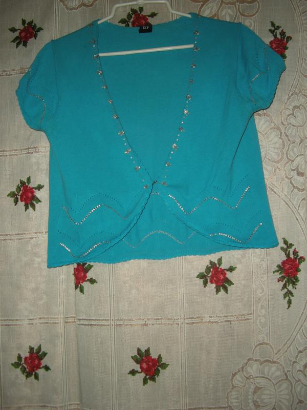 Шикарная кофточка-накидка василькового цвета,фирменная,натуральная-100%коттон,застегивается по центру на крючек,вырез,низ кофты и рукава ажурной вязки и обшиты пластинками,объем груди-100см.,длина-51см.