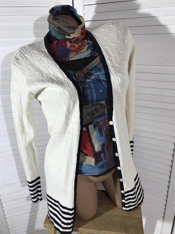 классный натуральный кардиган очень красивый бежевый и синие полоски на размер 36/38