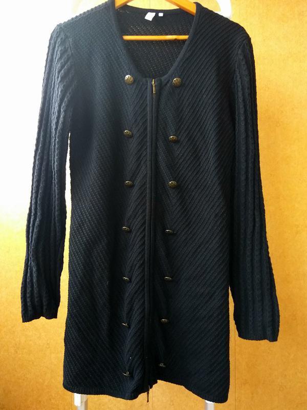 Теплый кардиган на молнии Есть карманы Новый, но бирка срезана (есть запасная пуговица) Длинна - 81 см Длинна рукава - 63 см ПОГ - 44 см ПОТ - 43 см ПОБ - 49 см Состав: 60% хлопок, 40% акрил