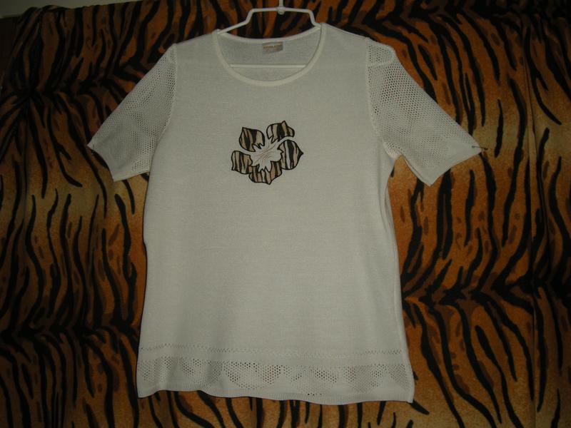 Шикарная кофточка-мягенькая,чуть блестящая белоснежная ткань,фирменная,натуральная-31%коттон,22%вискоза,47%дралон,рукава-нежная сеточка,низ кофты ажурный,объем груди-102см.,длина-65см.,на груди чудная аппликация в форме цветка.