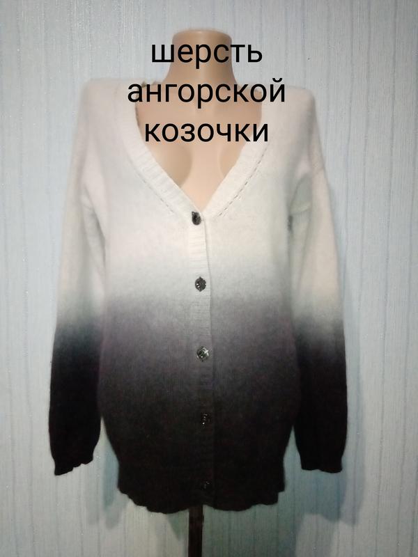 стильный кардиган градиентового окрашивания знаменитого бренда Diesel. Лого на спинке и пуговках. Плечо спущенное, сбоку разрезики, спинка на 5 см длиннее. Плечи 42, полгруди 48, длинна по переду 62, по заду 67, рукав от горловины 68.Бирка с составом срезана, на сайте указано 50% шерсть ангоры, номинальная стоимость на сайте 150$ Кардиган очень пушистый и мягкий. Состояние новой вещи.