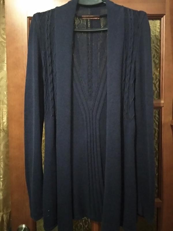 кардиган женский темно синего цвета.Размер46.Замеры рукав длина 77 см, ширина плеч 42 см, Длина 84 см, свободный покрой.Подарок к покупке верхней одежды.