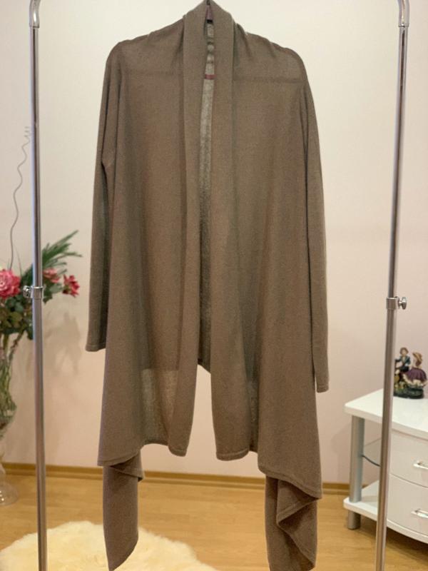 Кашемировый кардиган на запах цвет на фото соответсвует реальному {светло-коричневый, кофе с молоком} Качество бомбическое, очень легкий, невесомый, приятный к телу, теплый. Состояние идеальное, но есть 2 нюанса, показала на последних 4-х фото {на левой лопатке и на 1 крыле {след от механической вязки, смотреть фото с внутренней стороны} с наружной стороны ничего не видно, видно только, если на просвет смотреть {смотреть фото}. В одетом виде, на теле ничего не видно. Замеры : длина по спине - 82 длина рукава - 66 ширина рукава сверху - 18 ширина между плечами по спине - 41. Подойдет для размеров 10 -14/16. Если есть вопросы или нужны дополнительные фото - пишите!