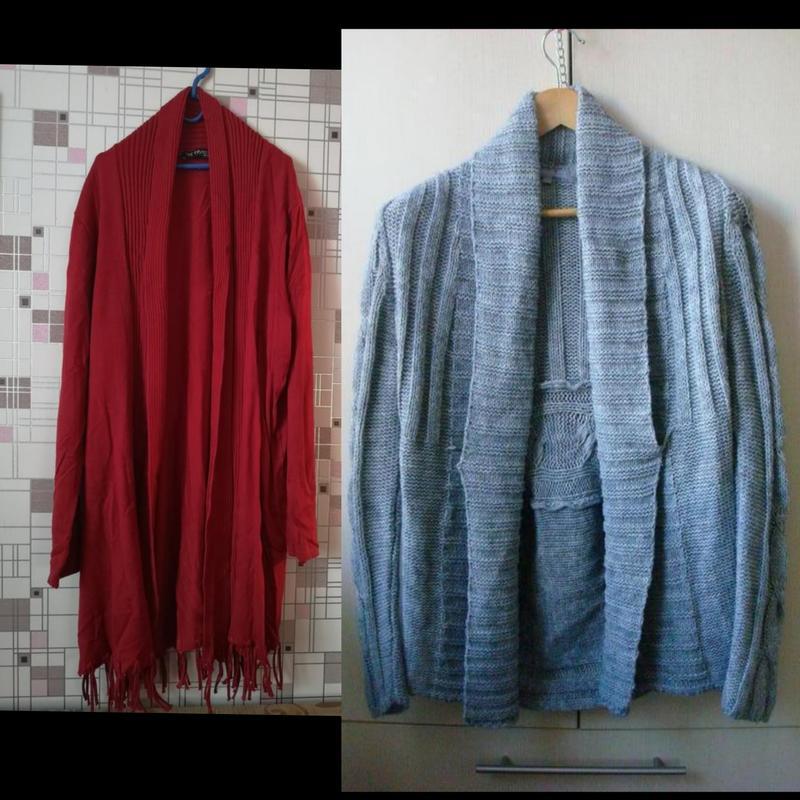Продам кардиганы в отличном состоянии. 1. Красный, длина 85 см +5 см бахромы, рукав 62 см. 2. Серый - длина 70 см. Длина рукава 60 см.