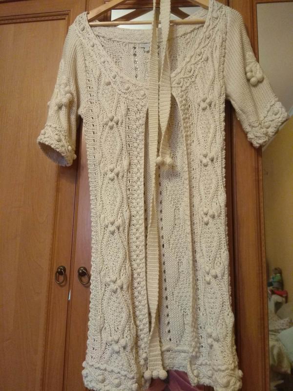Актуальный в этом сезоне вязанный кардиган из 100% хлопка (cotton). Короткий рукав, застёгивается на 2 крючка сверху, есть пояс.