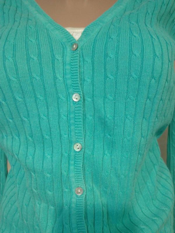 Кофта косами бирюзового цвета с натуральными перламутровыми пуговицами,хорошо тянется. Пог 42 см ,Пот 40 см,По низа37 см ,длина рукава от горловины69 см,длина кофты 55 см.