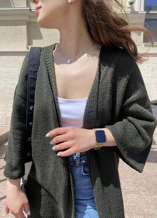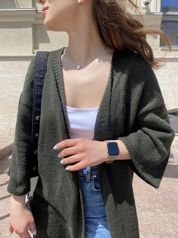 Кардиган oversize - з ним ви створите затишний та романтичний образ, водночас це незамінна та зручна річ у гардеробі. Відмінно поєднується з сукнями, спідницями, брюками та джинсами. Кардиган сплетений вручну. Повністю натуральний склад. Інструкція з догляду: ручне прання в теплій воді з рідким засобом, не віджимати і не сушити в пральній машині, не викручувати при ручному віджимі. Сушити у розкладеному вигляді на горизонтальній поверхні.