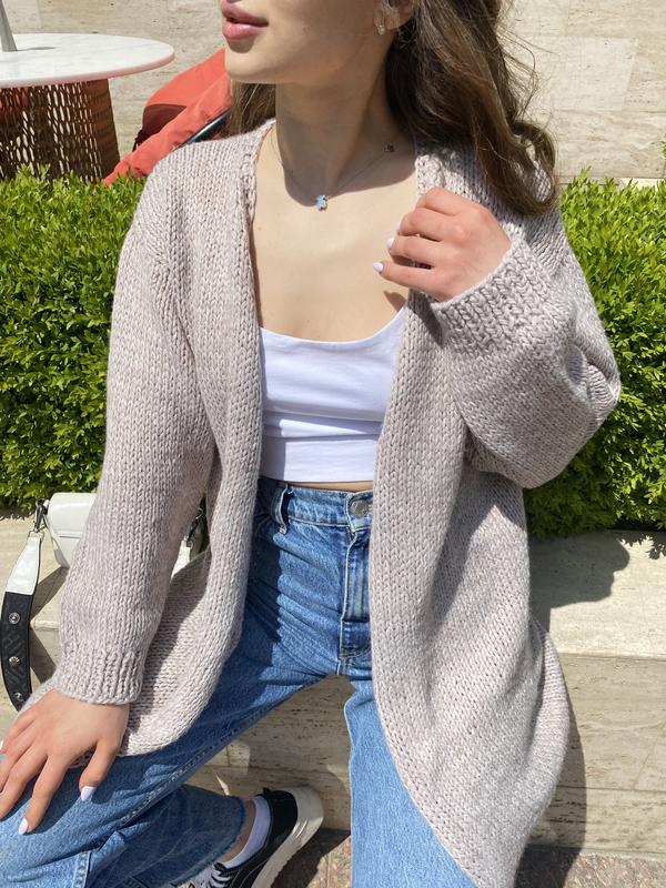 Кардиган oversize - з ним ви створите затишний та романтичний образ, водночас це незамінна та зручна річ у гардеробі. Відмінно поєднується з сукнями, спідницями, брюками та джинсами. Кардиган сплетений вручну. Повністю натуральний склад. Інструкція з догляду: ручне прання в теплій воді з рідким засобом, не віджимати і не сушити в пральній машині, не викручувати при ручному віджимі. Сушити у розкладеному вигляді на горизонтальній поверхні.