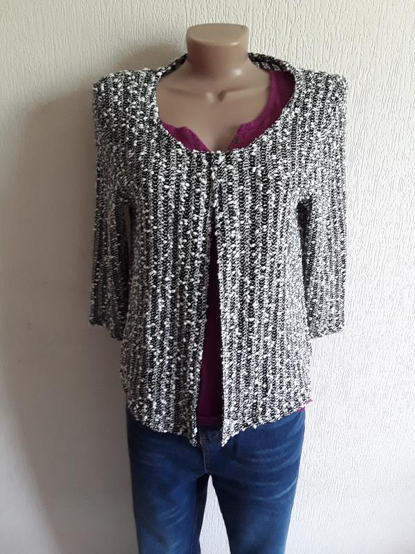Новый ,дефектов нет ! Тонкий , черно белое букле , на одной застежки вверху Размер указан М Плечи 40..42 см Пог 50....54 см Рукав 3/4 - 45 см Длина 60 см
