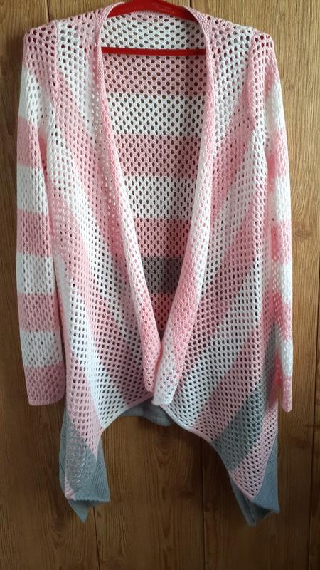 Красивий літній кардиган на розпах Легко поєднується і з платтям, і з брюками, і навіть з джинсами Передні поли подовжені, спинка рівна довжина спини 80 рукав 70 є кілька затяжок на внутрішній стороні ( 2 останні фото ) лицьова сторона ідеальна