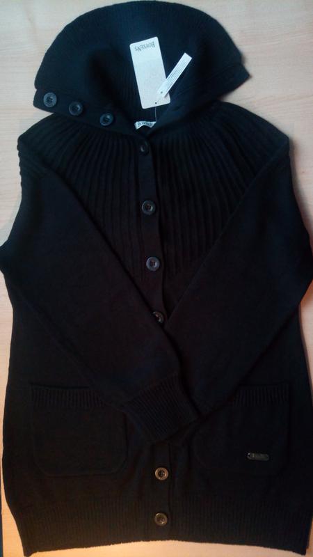 Красивий жіночий кардиган від фірми Boysens.Європейський розмір 44-46,рос.52-54.Красива в'язка,оригінальний відкладний комір. Довжина:80 см, Плече+рукав:76 см,від коміра, ПОГ:56 см, ПОБІДИ:60-61 див.