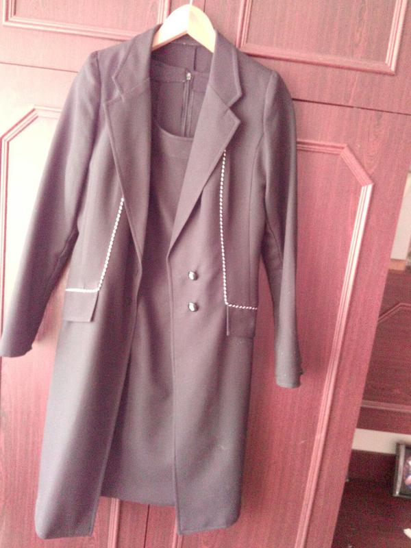 Черный удлиненный кардиган, с белым канотом. Есть к нему платье. Смотрите свои другие лоты. Торг уместен.