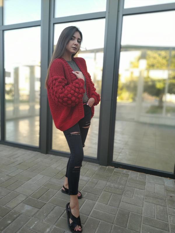 Женский вязаный кардиган малинки объемный рукава оверсайз ручная работа