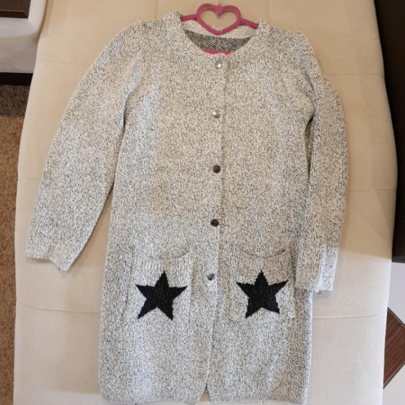 Гарний теплий сірий кардиган. На кнопках, має 2 кишені. Купувала доньці здається в Cropp. Наносилась). На останньому фото справа видно невеличкий недолік. В сукупному вигляді зовсім непомітний. Я його не зашивала. Можливо, таким і купила в магазині(. Висота по спині 82 см, ПОГ 46 см довжина рукава по плечу 56 см ( по внутрішньому шву 41 см).