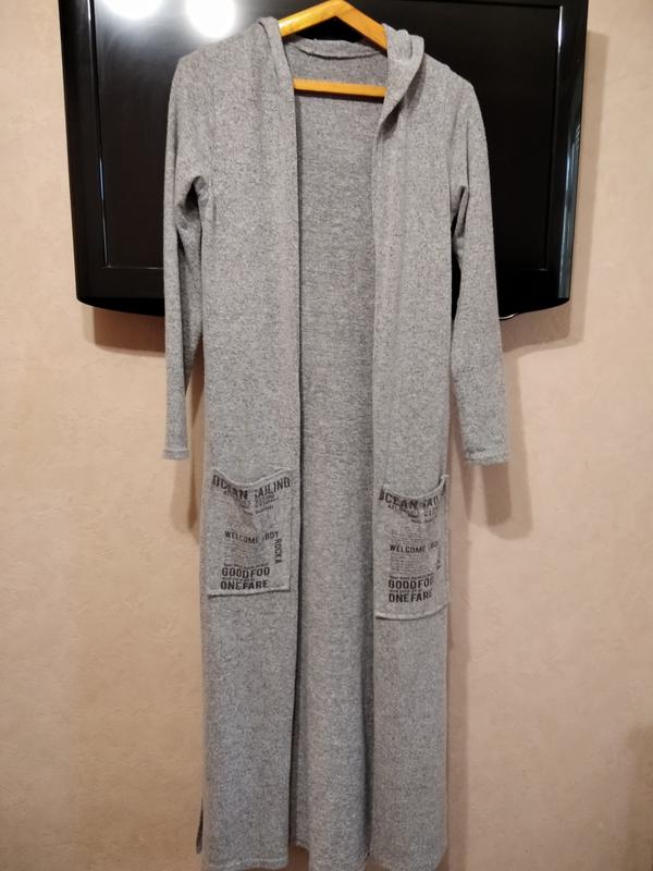 длинный кардиган с принтом два кармана накладных капюшон разрезы по бокам не плотная трикотажная вязка