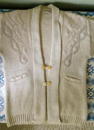 полу обхват: - грудь 64 см - бедра 60 см длина: - плечо 20 см; - рукав 54 см; - изделия 86 см высота проймы 30 см. материал: - шерсть; - акрил.