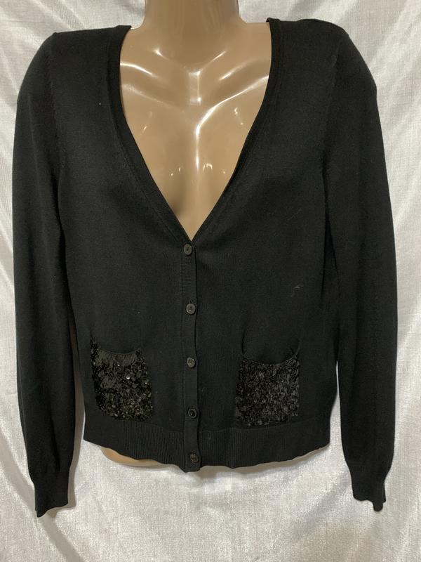 Трикотажна кофта классическго фасону. Трикотаж тонкий, мягкий, карманы расшиты пайетками. Замеры: длина - 59см., плечи - 42см.,рукав - 66см., ПОГ - 48см., ПОТ - 44см., ПОБ - 42см