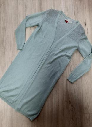 Продам длинный кардиган, красивый мятный цвет + вверху люрекс. Замеры: рукав 57.5 см, длина 96 см. Без пуговиц и т.д. Состояние отличное.