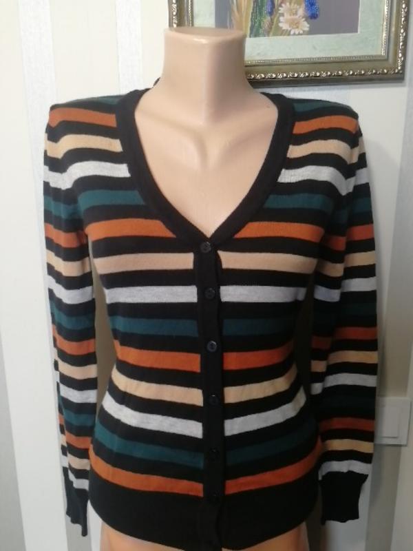 Яркий кардиган, очень хорошего качества (к сожалению состав ткани был указан на бумажной бирке, но в составе только натуральные нити, пару процентов эластан), размер XS
