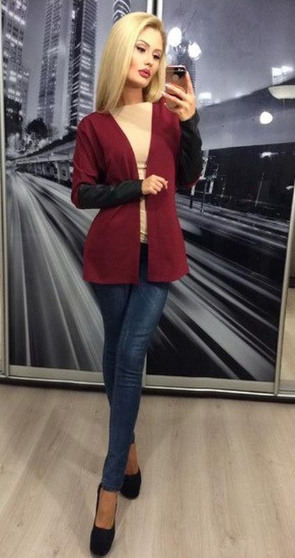 Кардиган новый размер универсал, ткань - турецкая двунитка,рукава экокожа Длина кардигана - 67см. рукава - 68см.