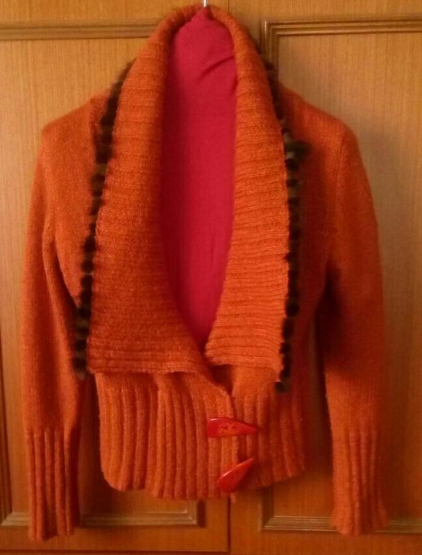 Воротник обрамлён норочкой.ПОГ-47,ДИ -53, рукав-60см.цвет очень красивый,терракотовый.