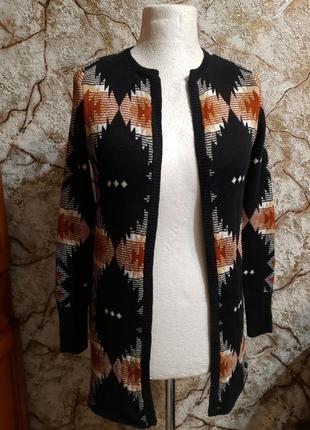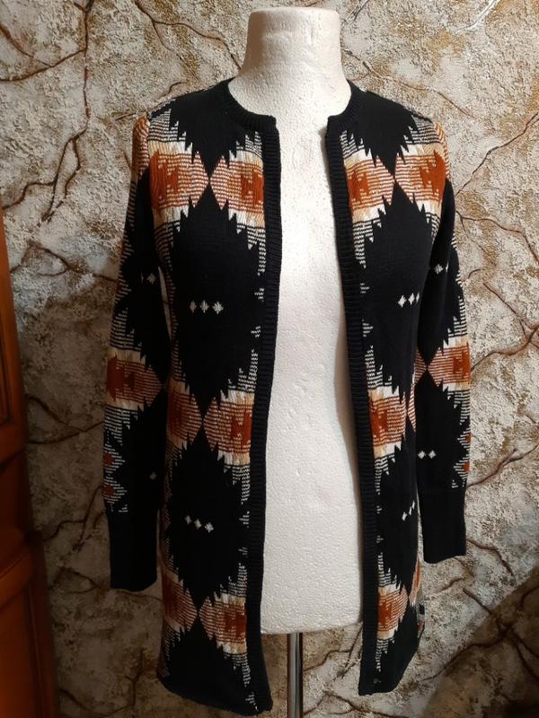Замечательный темно- синий кардиган с узором. Очень комплиментарный узор, с которым можно сочетать много низов. подойдёт как с брюками так и с юбками