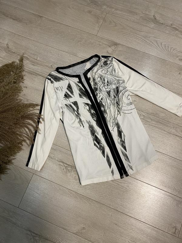 На теле нет)замеры на фото )рукава трёхчетвертные воротник круглый,замок молния-дэкор)в составе эластан коттон)кофта в абстрактный принт)из нюансов-есть пятнышки-выводить не пробовала) Родиной абстракционизма является Россия, ведь первую композицию в стиле этого направления живописи создал наш художник Василий Кандинский в 1910 году. За годы своего существования «беспредметное искусство», как часто называют абстракционизм, неоднократно подвергалось критике и гонениям. Долгое время центр абстракционизма находился в Германии, но с приходом к власти фашистов был вынужден переместиться в США, так как это направление в искусстве не поддерживало их идеологию Если насчет абстрактных картин, висящих на стенах, можно спорить, доказывая выразительность цветовых элементов и форм, то ткани с подобными рисунками не вызывают никаких нареканий, поэтому дизайнеры давно и успешно используют их для создания одежды. Все потому, что, как сказал Ив Сен Лоран, «главное в платье – женщина, которая его надевает»! Прошло уже более 100 лет с момента зарождения абстракционизма, но подобные рисунки на тканях по-прежнему называют «авангардными»! Впрочем, исследователи полагают, что именно через сто лет к культурным явлениям проявляется наибольший интерес. В моде сезона осень-зима 2014-2015 абстрактным принтам уделили внимание многие бренды. Ярко и броско смотрится молодежная коллекция бренда Just Cavalli, модели которой украшены эффектными абстрактными принтами: По безопасной оплате не работаю)) Отправка каждый день кроме воскресения)) Отправляю новой и укрпочтой)) Полная оплата на карту Приватбанка)) Обмена нет,возврата нет)) Скидка есть ,в разумных пределах)) Удачных вам покупок 🛍📦🛍📦🛍📦🛍📦🛍📦