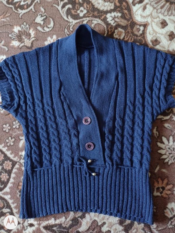 В'язання пов'язана безрукавка 50 відсотків акрил, 50 - шерсть. Ідеально до білого чи синього гольфу. Талія стягується шнурочком. Спереду два великі ґудзики. п/про грудей - 50, довжина - 56, низ - 46, добре тягнеться.