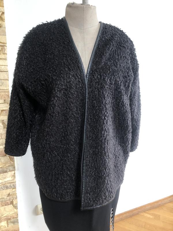 Кардиган чорний .Обшитий повністю шкіряною бейкою. Довжина 65 см. Рукав 3/4.