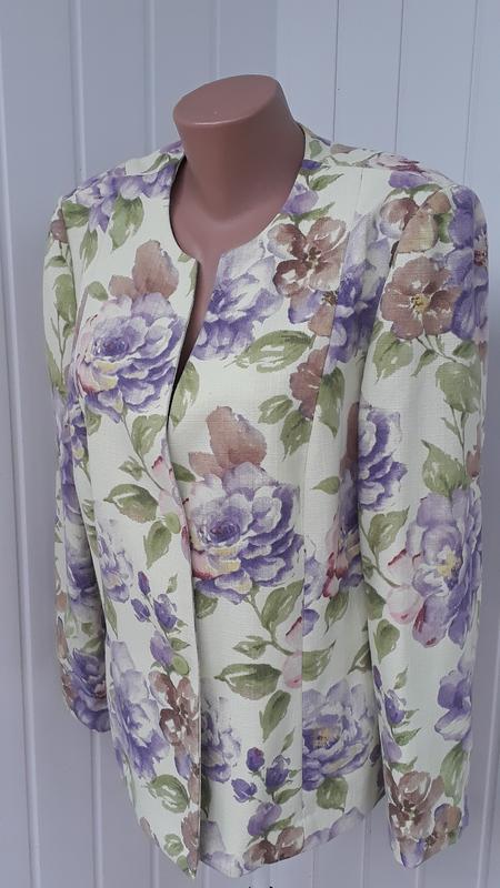 Очень красивый, стильный кардиган-пиджак с нежным цветочным принтом в идеальном состоянии, одевался несколько раз, став не по размеру. Красиво смотрится с гипюровым платьем, которое находится в своих объявлениях. Плечи 44 см, пог 55см, пот 52см, поб 59см, длина 65см, рукав 61см