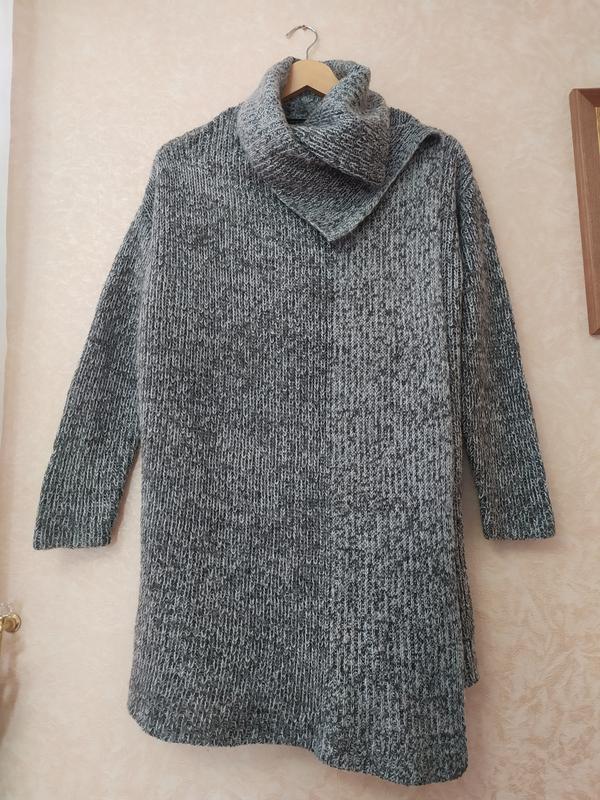 Вязка- английская резинка. Занижена линия плеча. Цвет- серый меланж. Размер- UK-10. ПОширины-56см, Длина рукава от горловины-73см, Длина-83см.
