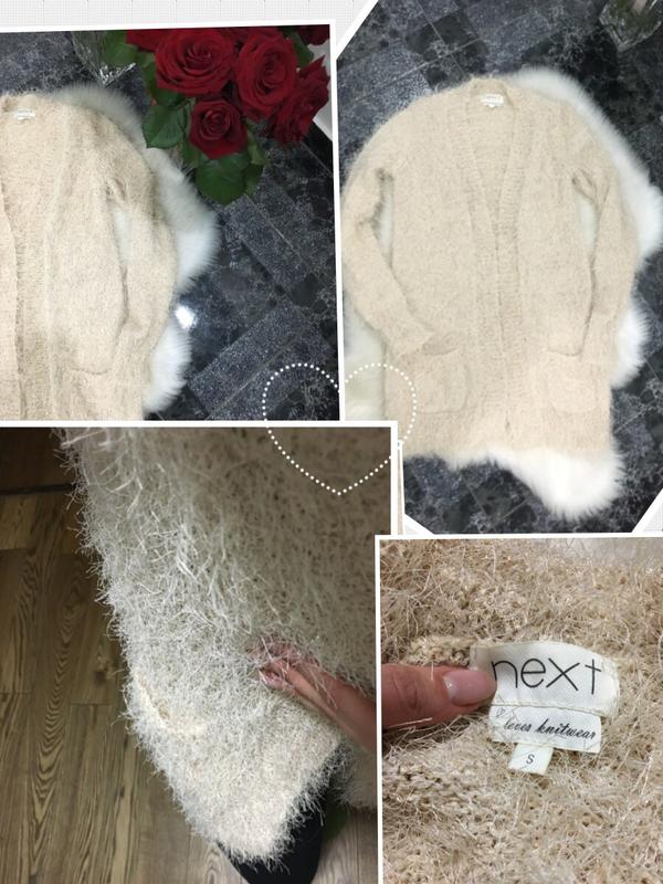 Кардиган в кольорі золота, дуже гарно дивиться) Приємний до тіла , дуже легко тягнеться, думаю підійде і на m. Ширина в області грудей - 43-44 см. Довжина - 80 см. Довжина рукава від плеча - 66 см. Є кинееі на переді з обох сторін.