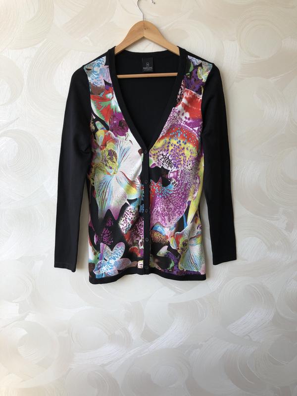 Гарна кофтинка з орхідеями Madeleine. Рукавчик і спинка чорна. Дуже приємна на дотик. Відмінний склад , не буде катишків 😉. Стан ідеальний. Розмір M/S. Довжина 68 см Пог 44,5 см Плечі 38 см, Рукав 63 см