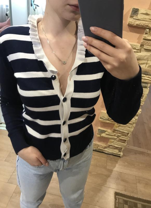 Синий кардиган в белую полоску на пуговицах. Размер: XS-S🌸 Ткань: хлопок. На рост: 160-165🌸 Бренд указан на бирке.