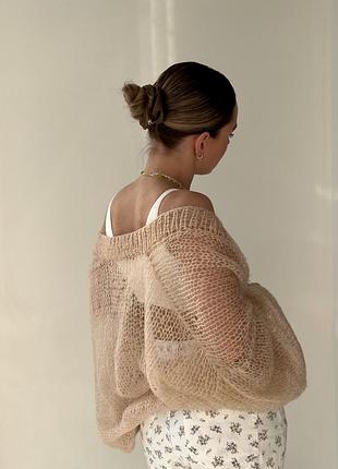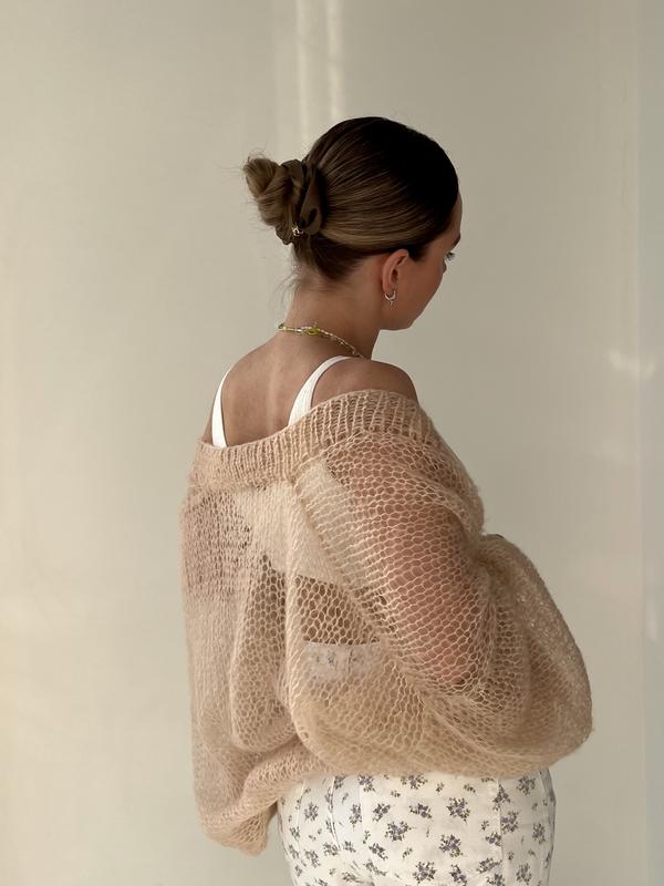 Кардиган-павутинка оверсайз. Приємний до тіла, легкий та комфортний у носінні. Рукава закінчуються нетугими манжетами, що гарно підкреслюють зап'ястя. Дана модель виготовлена повністю вручну. Кардиган представлений в одному розмірі, додає образу легкості та витонченості. Склад: 75% мохер, 25% поліамід.
